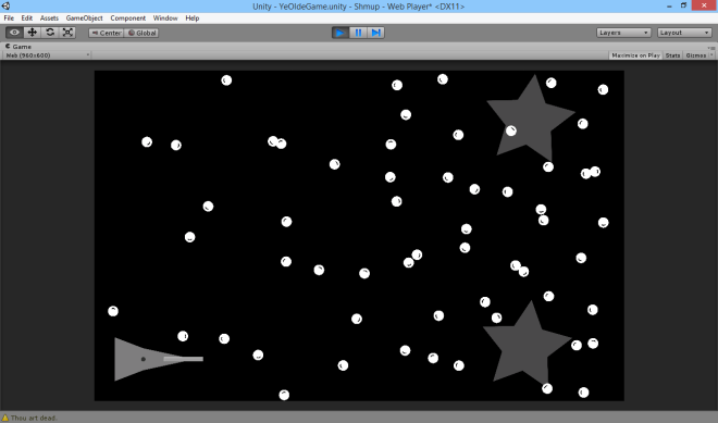 Those stars spawn one bullet every .1 second from one of their tips, and rotate clockwise through all the five tips. Also, the whole star is rotating at variable rates. They're the only enemy I have so far and were inspired mostly by the Star brush in Gimp. T...