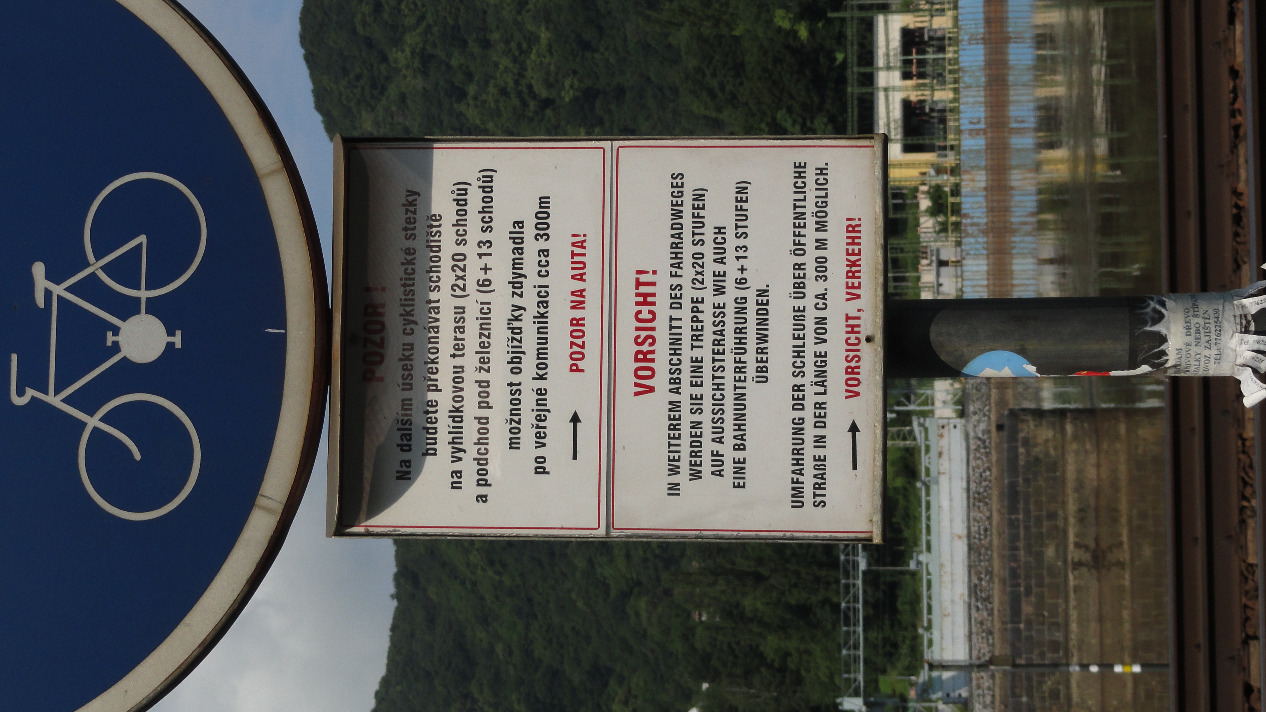 Usti nad Labem, near the Elbe lock. The sign warns of steps on the bike path. (For the record: Bike paths should not have steps.)