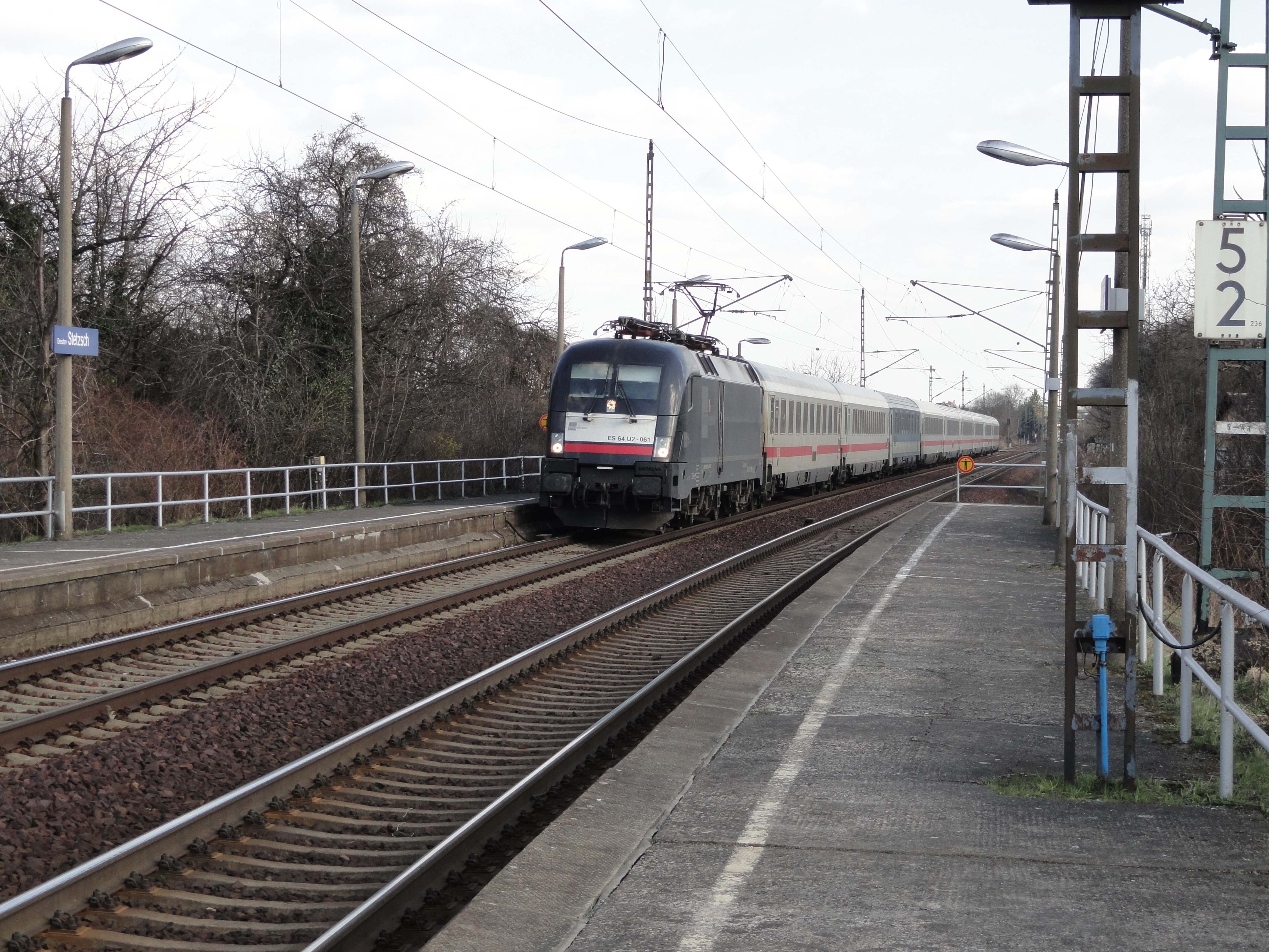 A MRCE Dispolok is hauling a Eurocity from Prague through Dresden-Stetzsch halt.