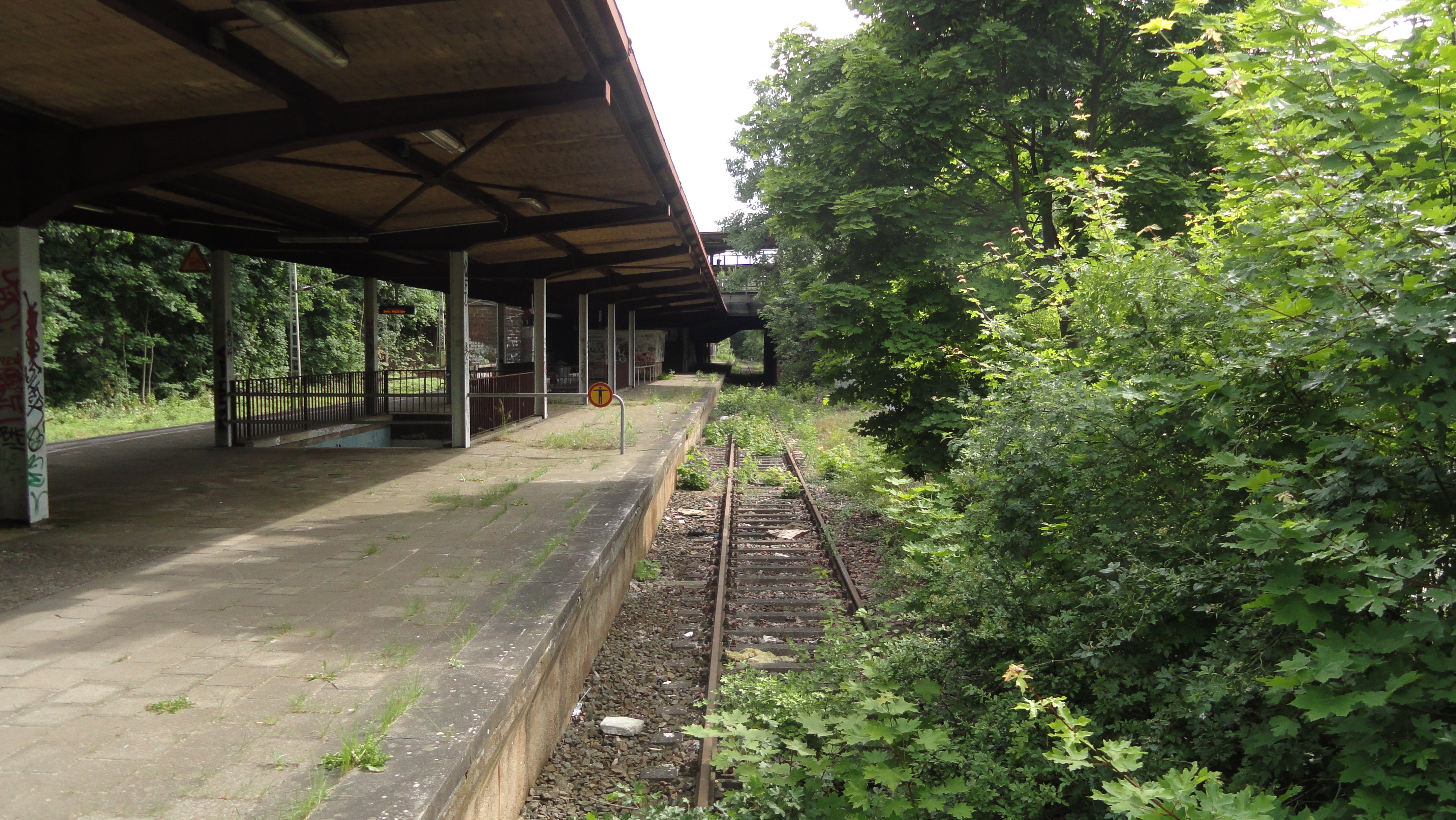 Auf diesem Gleis fährt kein Zug mehr. Nur noch das durchgehende Hauptgleis ist in Betrieb. Der Bahnsteigtunnel ist zugemauert, stattdessen führt jetzt ein Steg auf den Mittelbahnsteig.