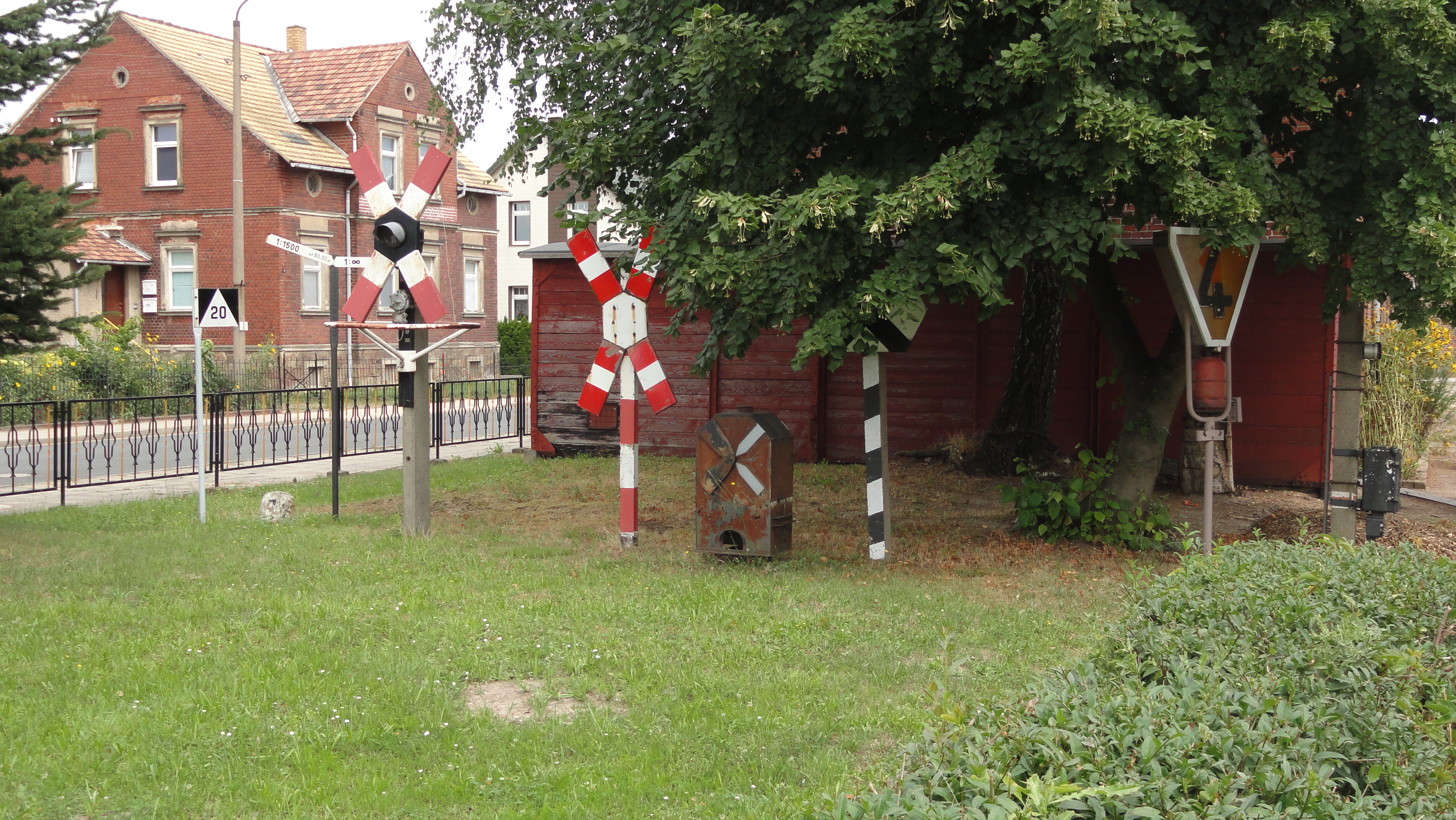 Einige Straßenschilder und Tafeln der Schmalspurbahn sind im Bahnhof Mügeln ausgestellt.