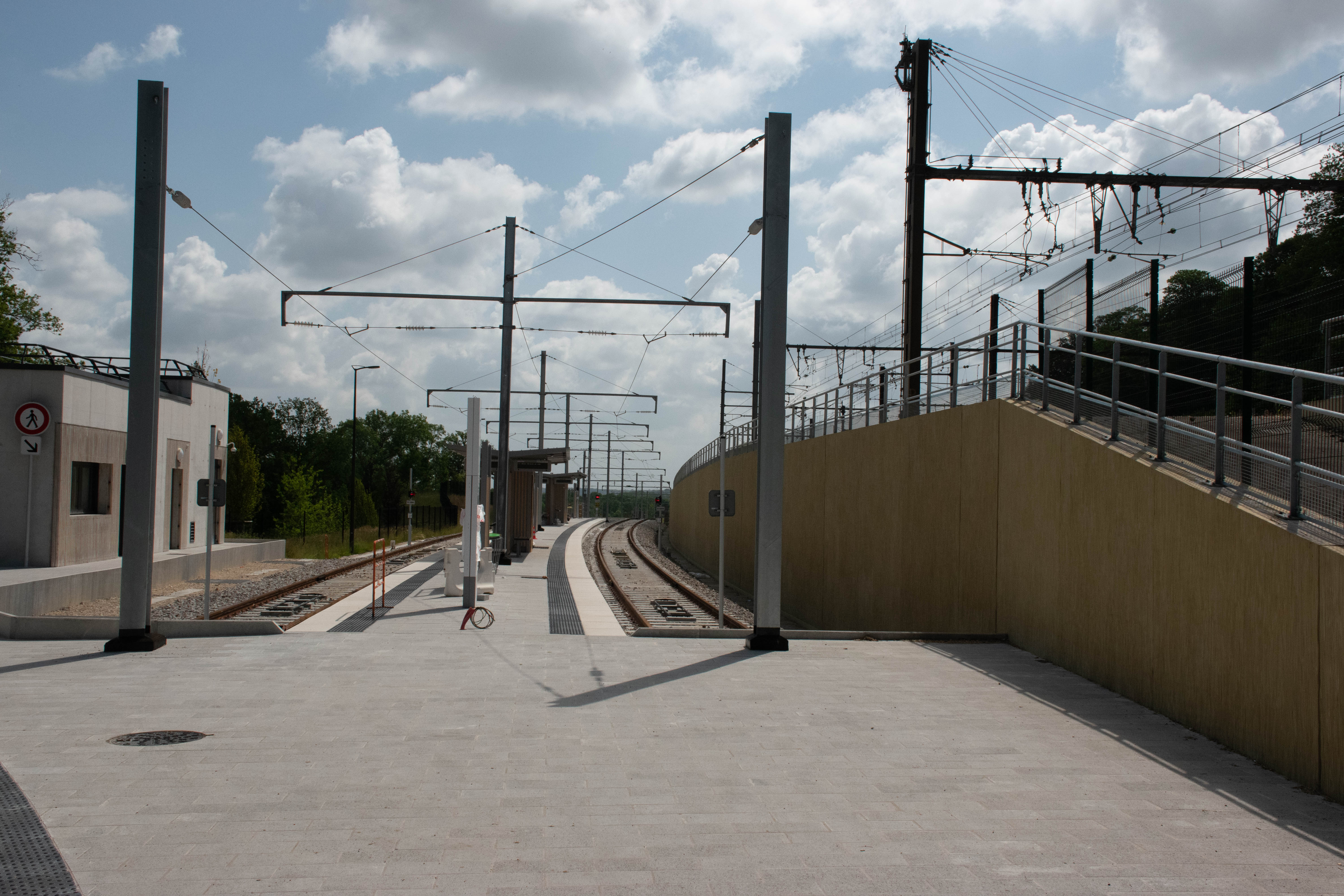 This tram stop was still gated off in May 2022 (my camera lens is poking through the chainlink fence), although the line was already going through running trials.